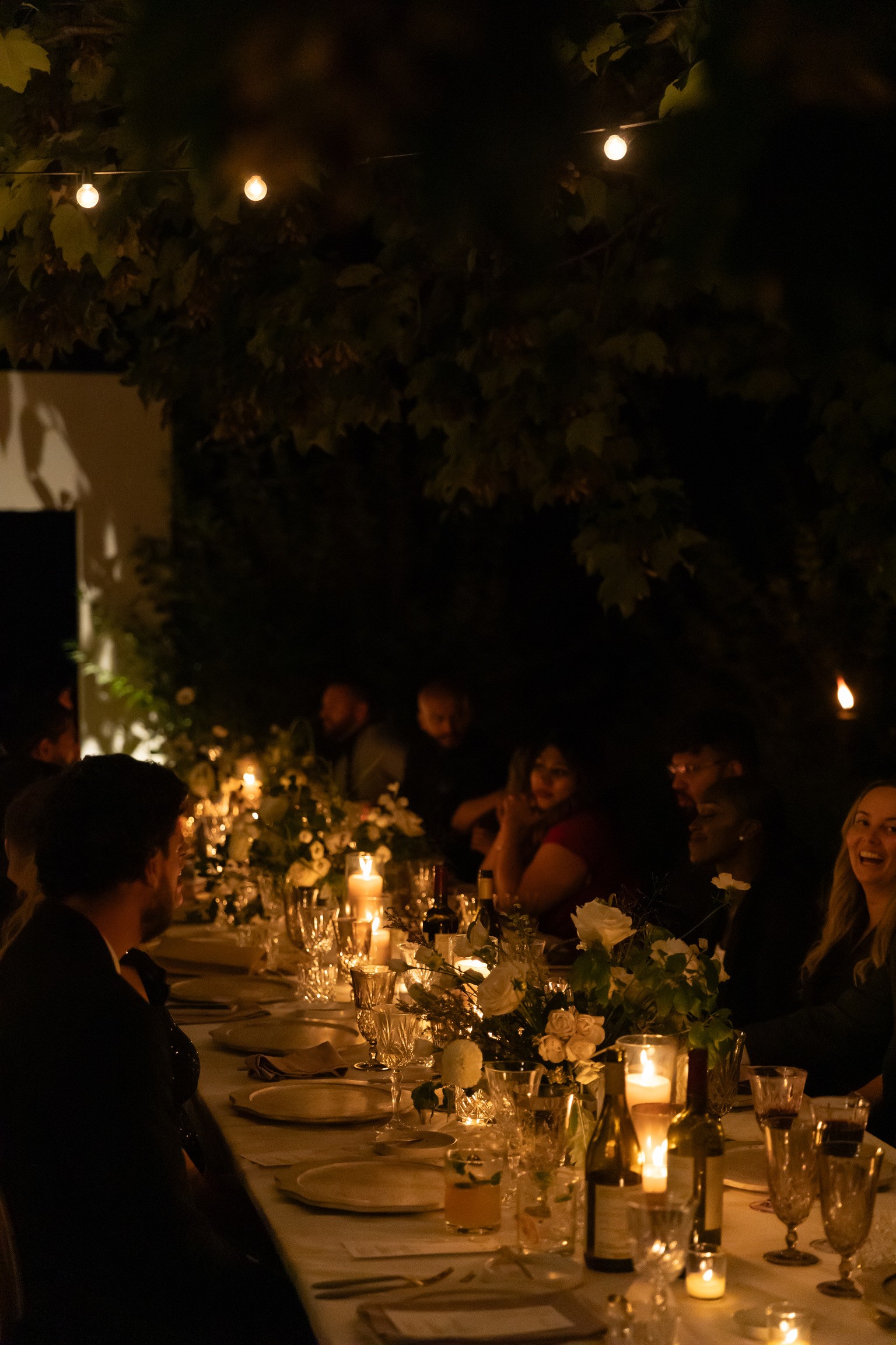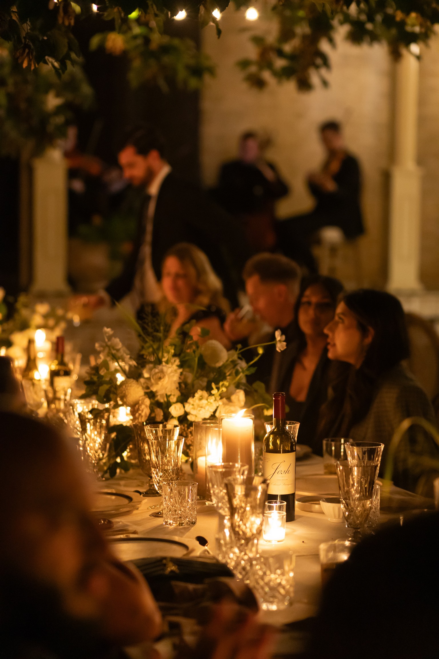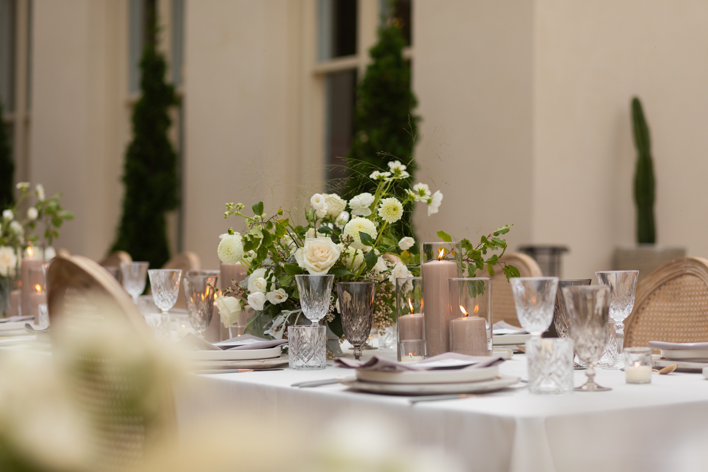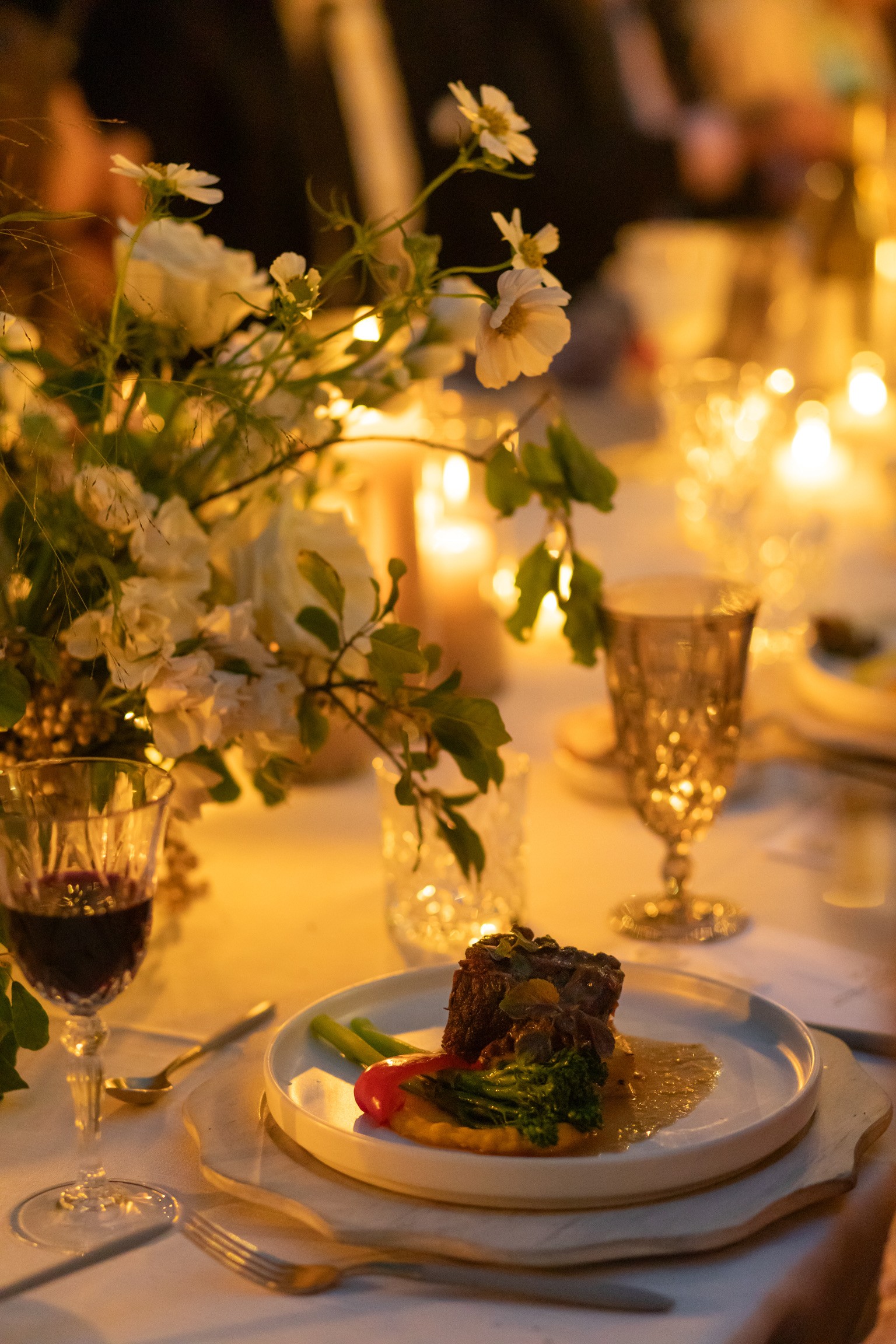 On a wedding day, it’s the way everything sits together that stays in your memory. From tablescapes that seem to gently cascade down a courtyard, to a single intimate table tucked inside by the fire, each element is placed so the day feels unhurried and deeply felt. For some couples that might mean soft, tonal layers and clustered candlelight; for others, bolder colour, sculptural flowers, or almost nothing at all, letting the room and landscape do most of the work. The spaces in between matter just as much as what’s on the table. Guests might arrive through a quiet hallway where a champagne tower waits for its moment, pause by a mantel lit with a few tall candles, then drift outside under strings of light or an open sky. Paths, seating, and small transitions are all considered so movement feels natural—no rush, no confusion, just a gentle, steady flow from ceremony to drinks to dinner. No two weddings look the same. The mood, palette, and details shift with the couple, the season, and the space. What remains constant is the intention: to build an atmosphere that feels intimate, meaningful, and a little bit cinematic; less like an event you attended, and more like an experience you fully inhabited.